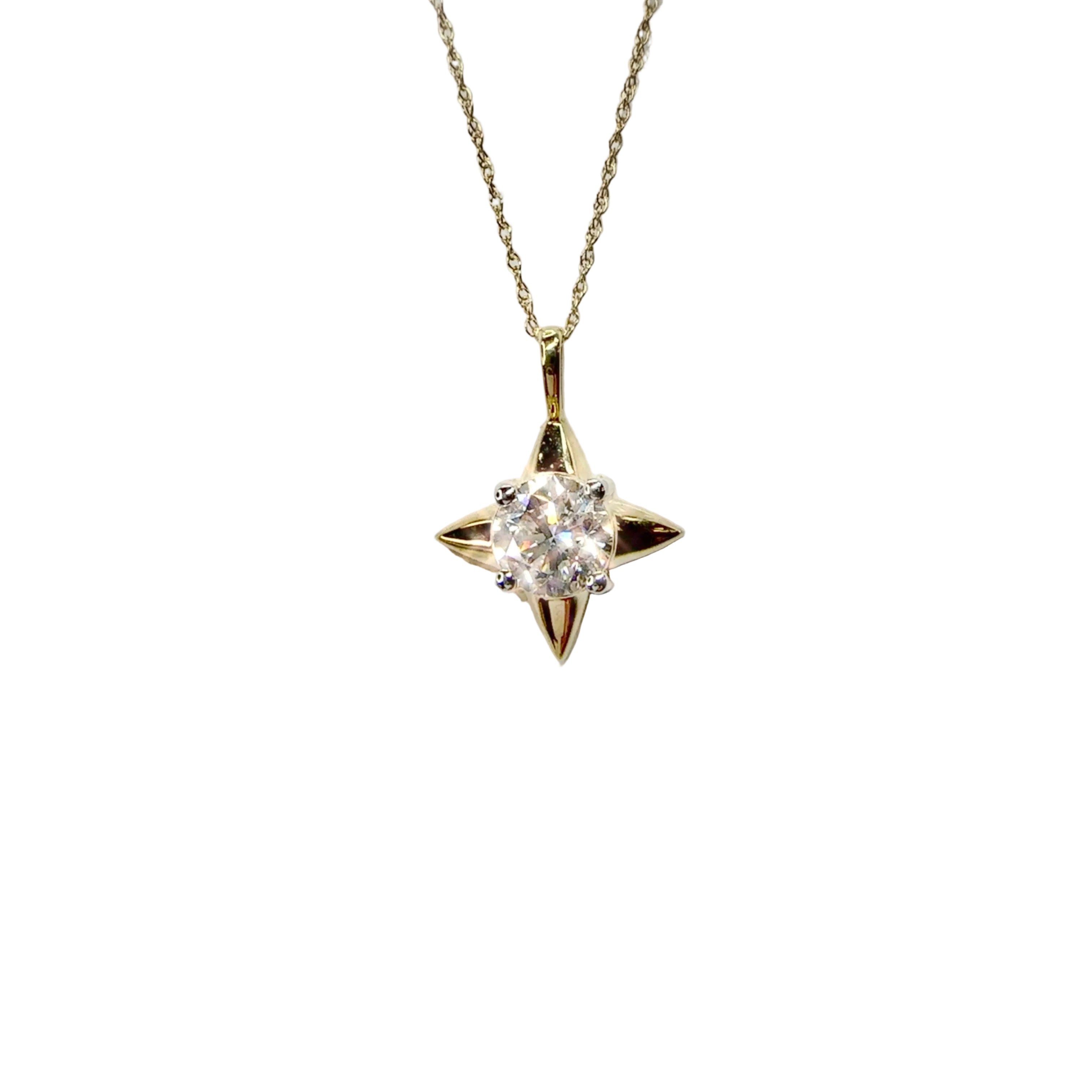 10k yellow gold star pendant set with a 1.00ct round brilliant lab grown diamond in the center (F,G VS-SI) and hangs on a 10k yellow gold 18in chain. Perfect for the star in your life.