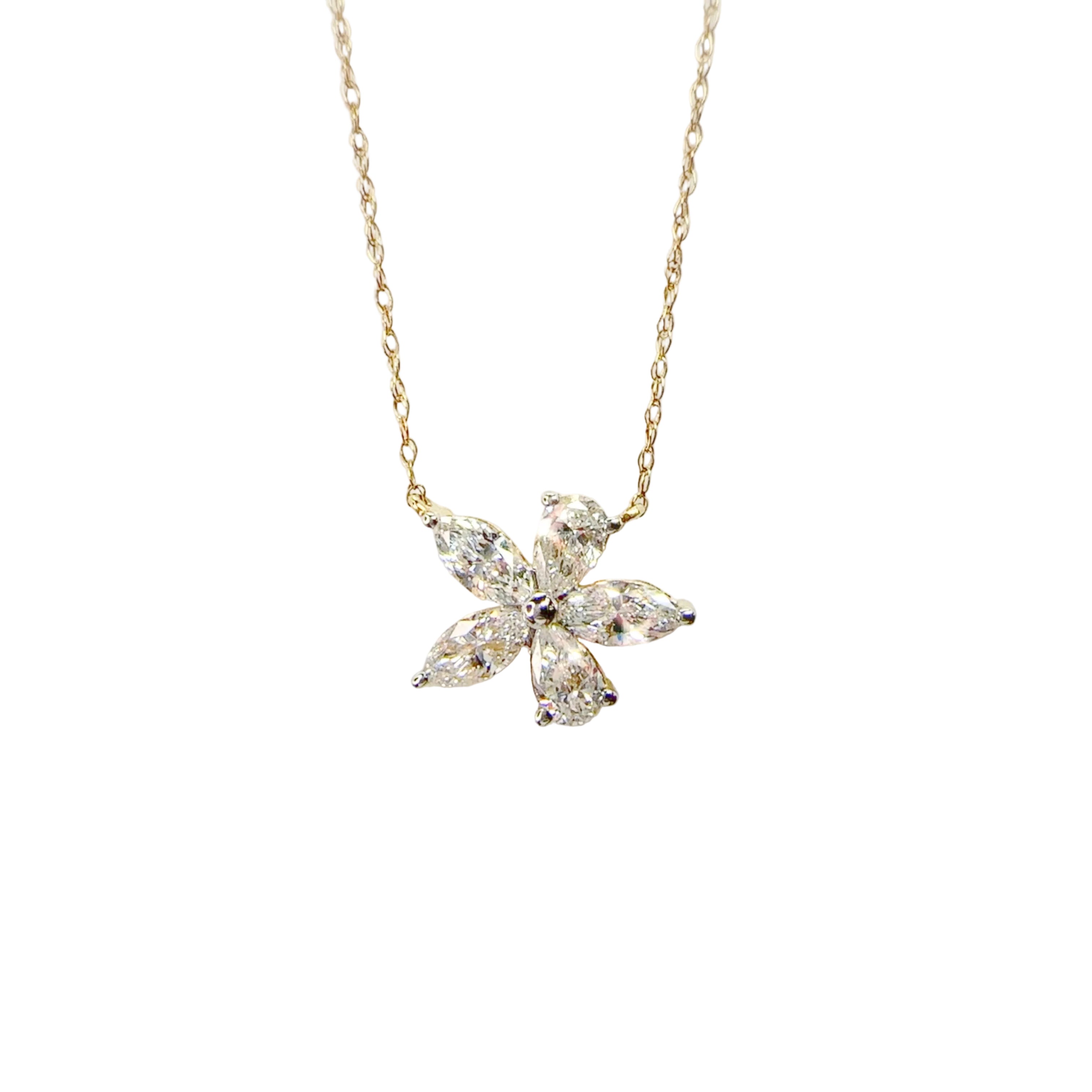 10ky lab grown diamond abstract flower necklace (1.00ctw F,G SI-VS) 3 marquise , 2 pear shapesCaptive on an 18in chain.