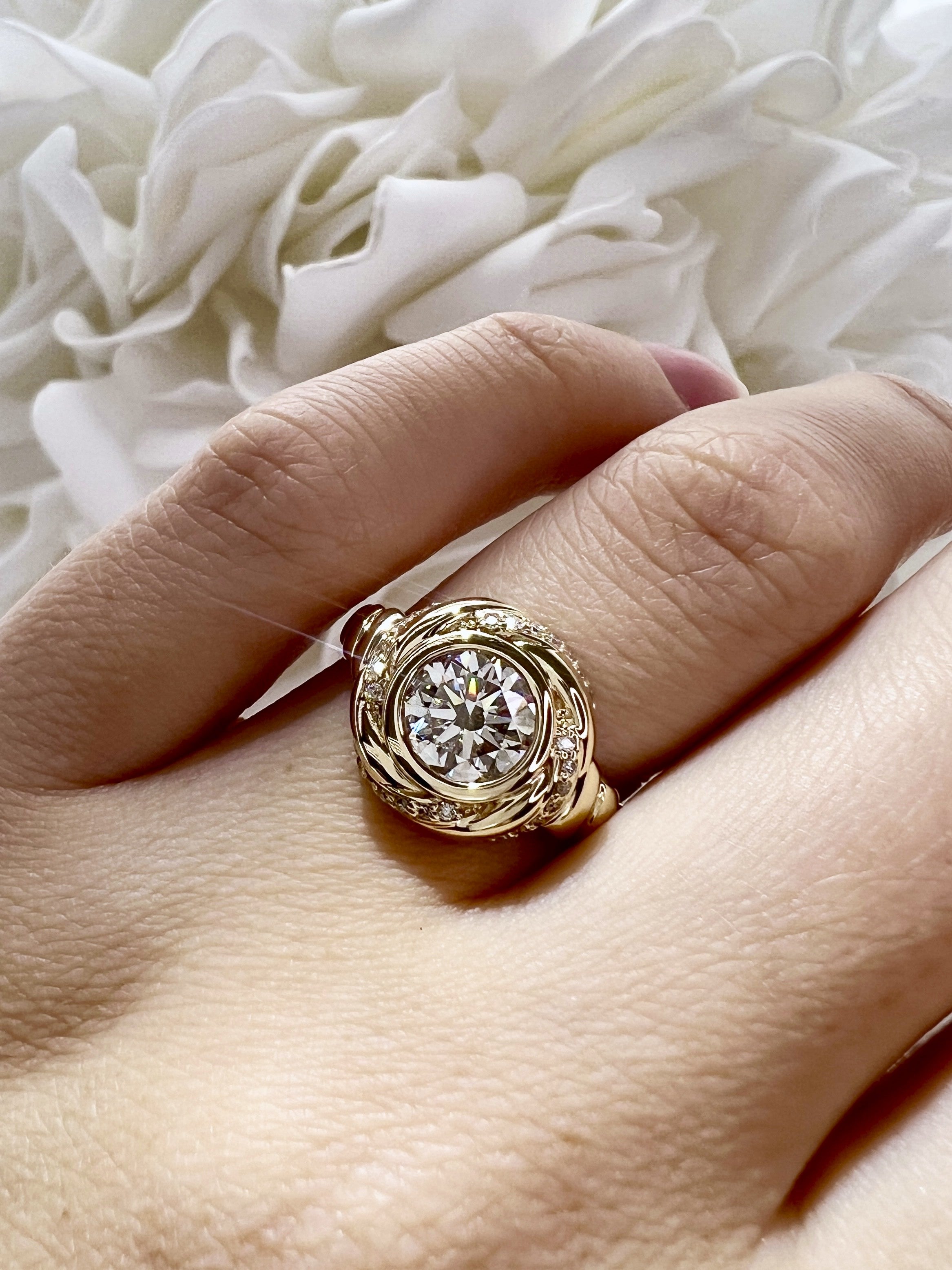 14k yellow gold bezel set 1.50ct (F+,VS2) round brilliant cut lab grown diamond with swirled gold accented with 28 round brilliant lab grown diamonds at 0.11ctw and a twisted band. The ring currently in stock is a finger size 6.5.