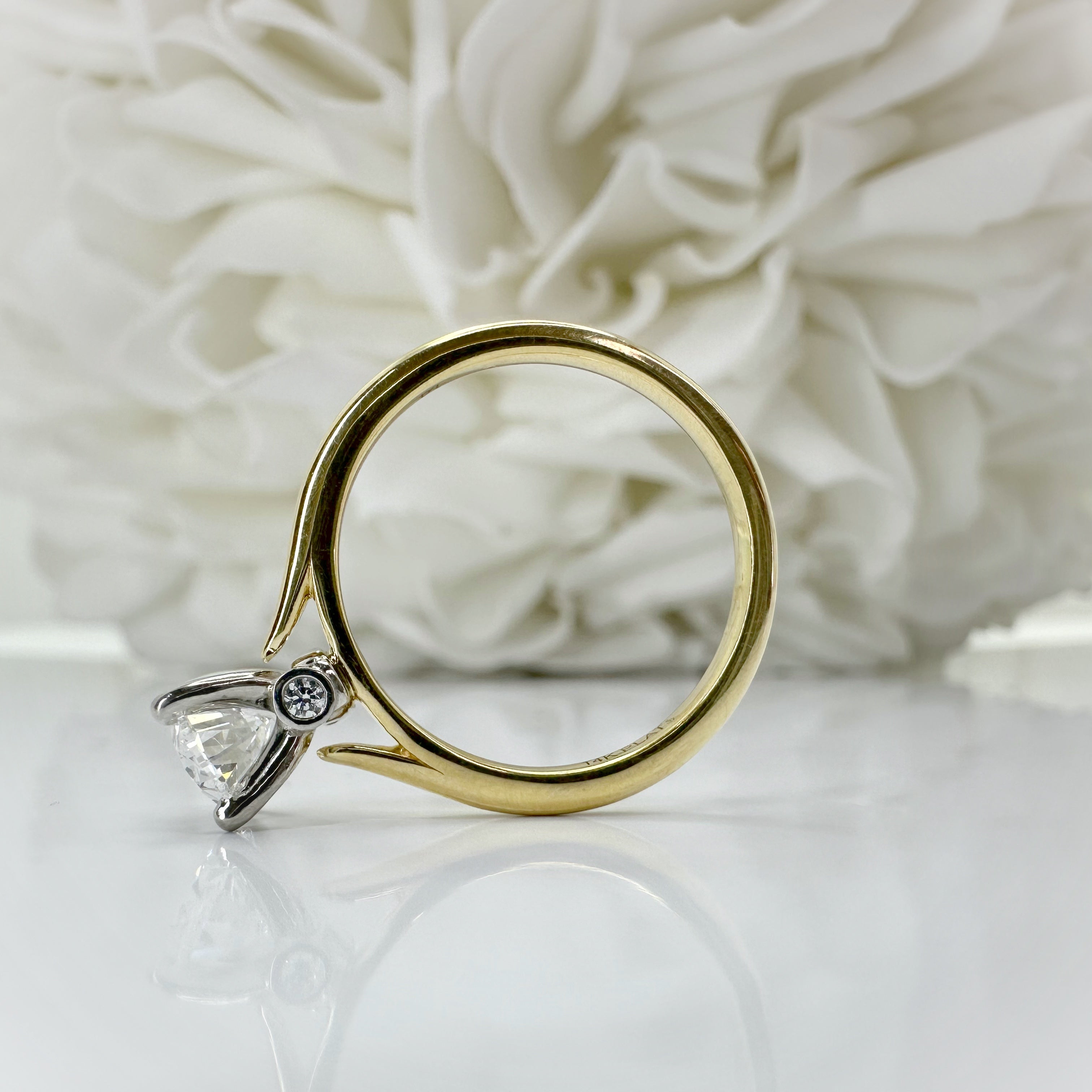 This lovely solitaire features a 1.05 carat lab grown oval cut diamond set into platinum with 2 bezel set lab grown accent diamonds underneath that are1.50mm each totaling 0.022 carat (VS clarity, F+ colour) and a 14k yellow gold cathedral shank.- Center stone is 1.05 carat E color,VS2 clarity, Excellent...