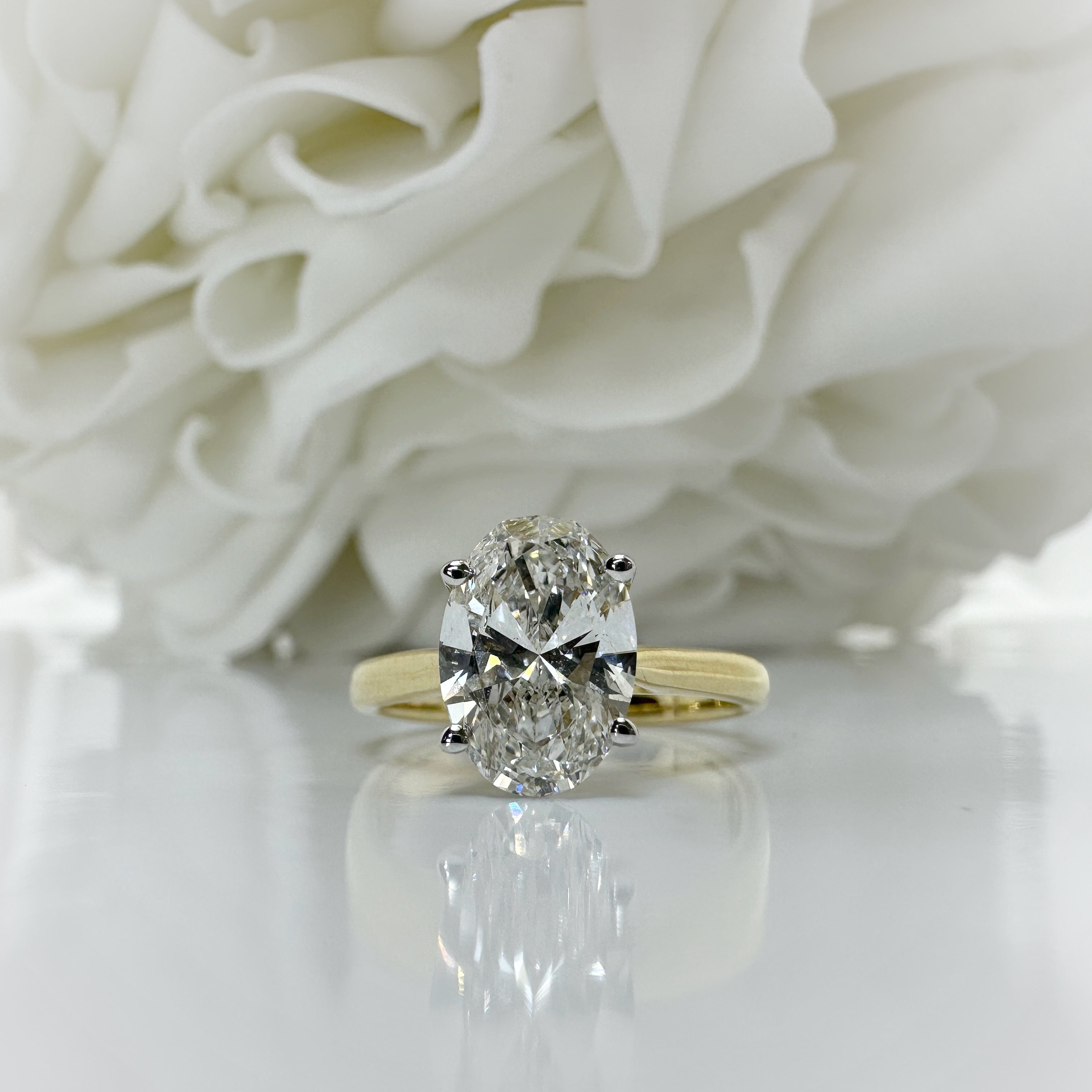 Go to the shop14k yellow gold solitaire oval cut lab grown diamond engagement ring. Set with a 2.00 carat LG oval diamond: F in color, VS2-SI1 in clarity, Excellent cut.