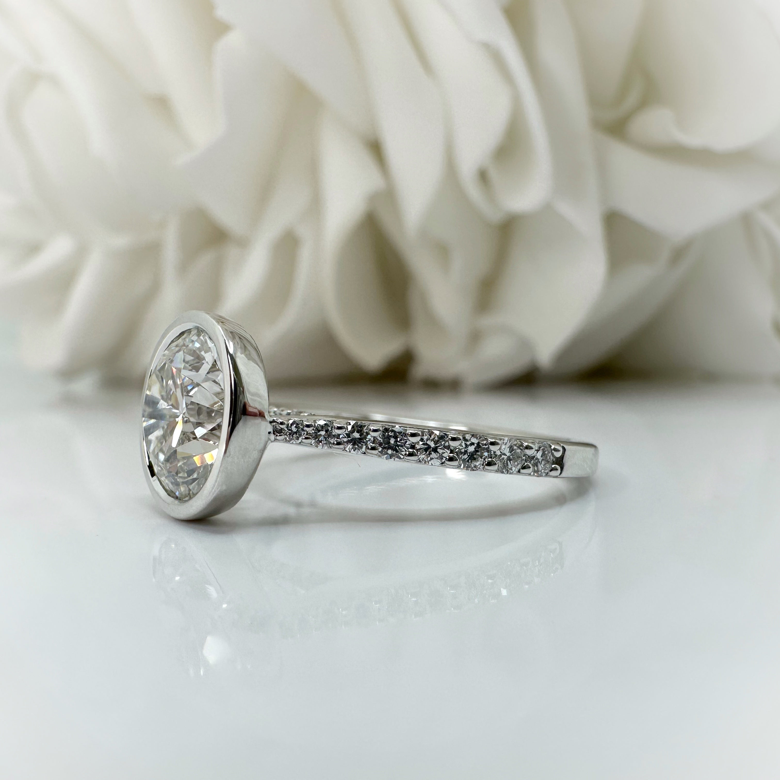 10k white gold bezel set lab grown diamond engagement ring set with the following 2.03ct Round Brilliant E colour, VS1 clarity , EX IGI CERT LG717587527 (8.05x8.09x5.05) and 28 lab grown round brilliant accent diamonds 0.27ctw F,G (SI) The ring currently in stock is a Finger size is 6.5.