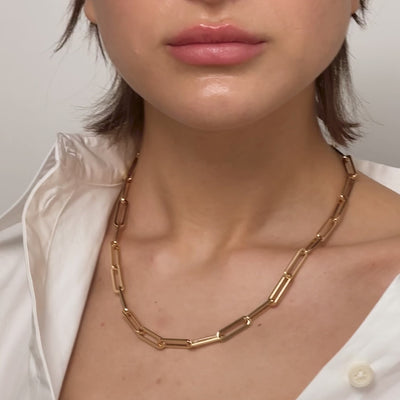 Go to the shopA modern paperclip necklace, with a refreshed, crisp silhouette. This design includes non-removable extender rings, making it easy to adjust to your ideal length. Finished in high-polish gold.