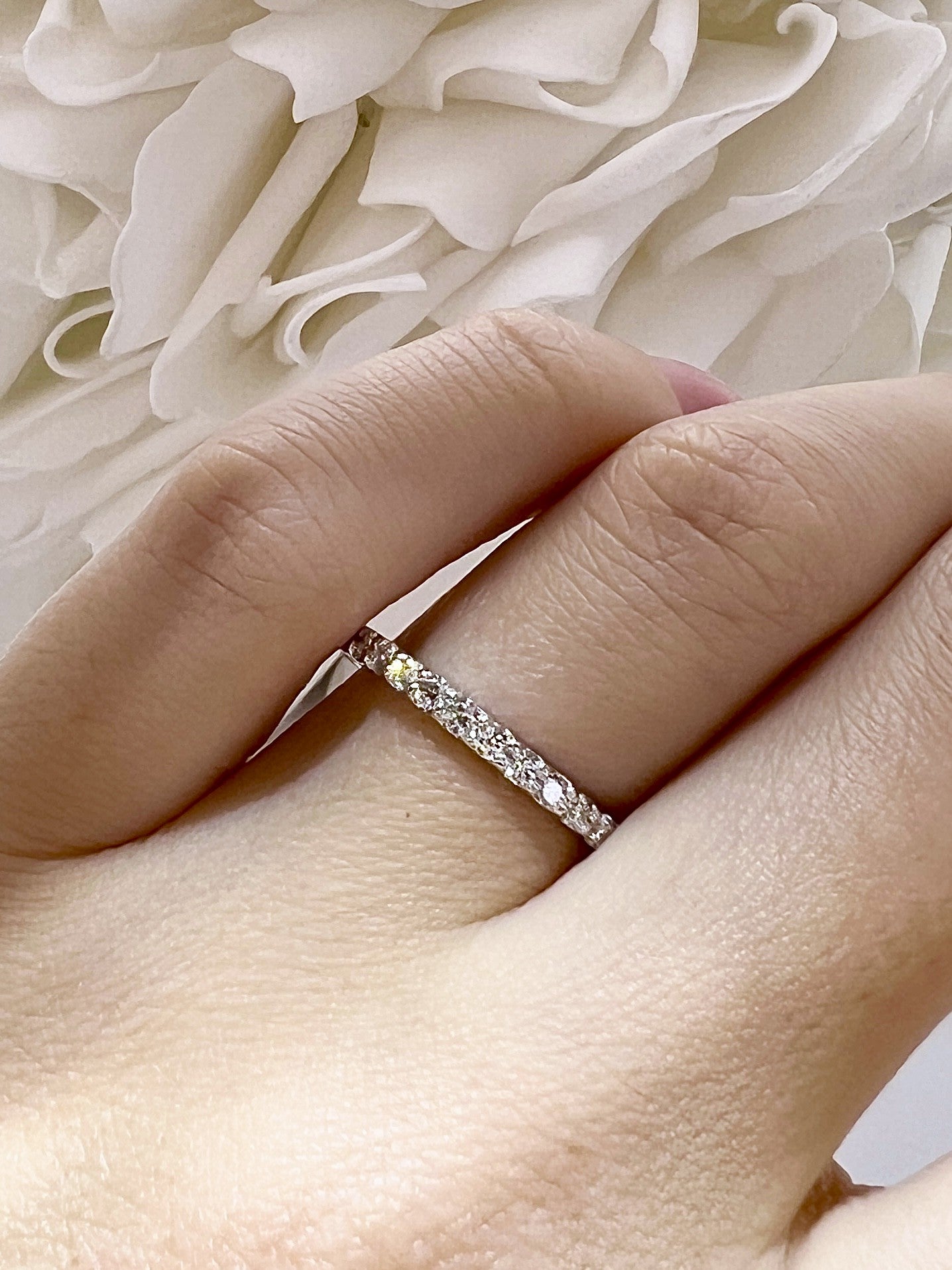 This 14k white gold band is set with 13 round brilliant cut natural diamonds set in prong settings with a total carat weight of 0.32ctwThe ring currently in stock is a finger size 6.5.