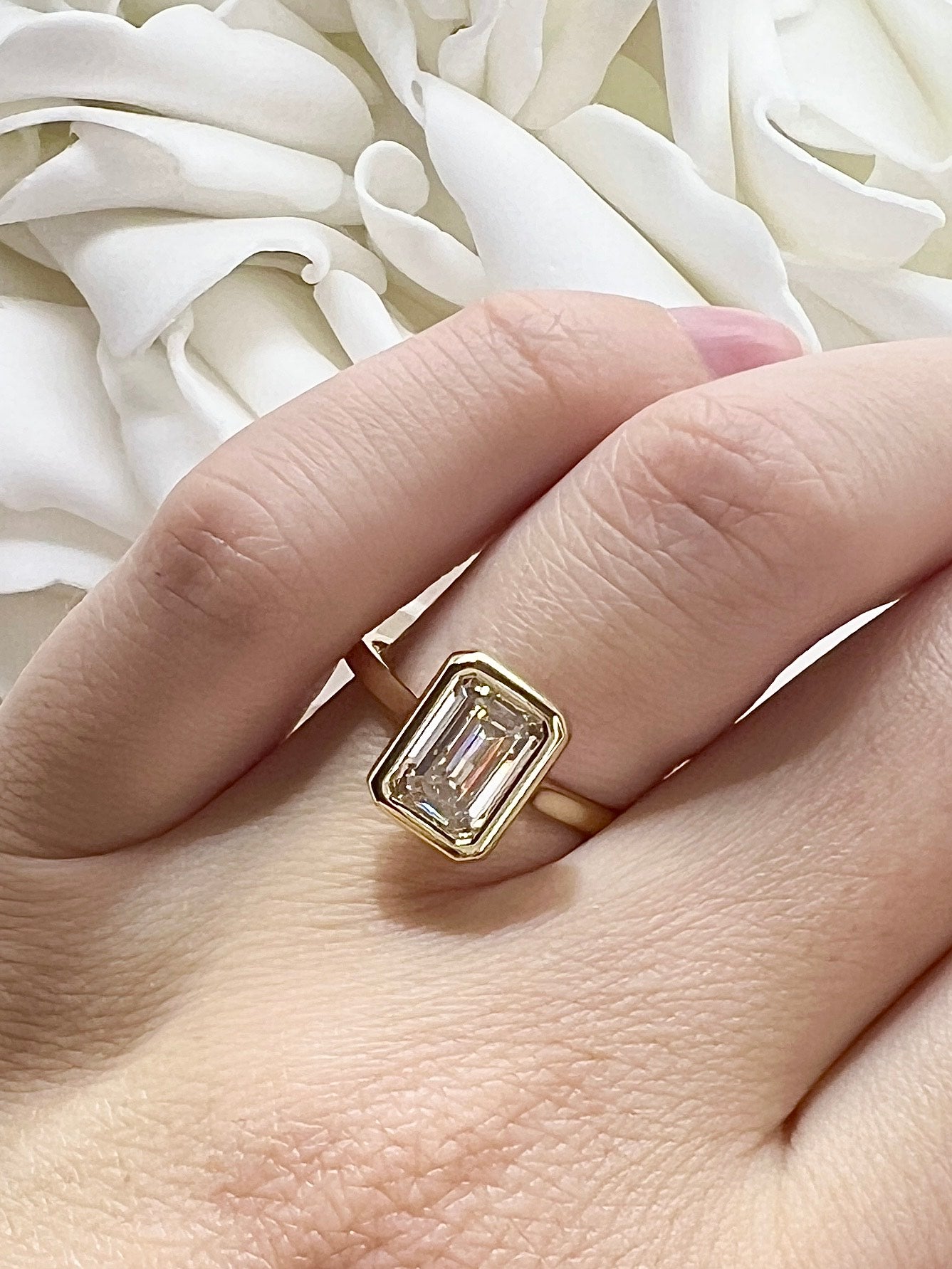 14k yellow gold bezel set solitaire emerald cut engagement ring set with a 2.00 carat lab grown diamondF Color VS2 Clarity in finger size 7.25