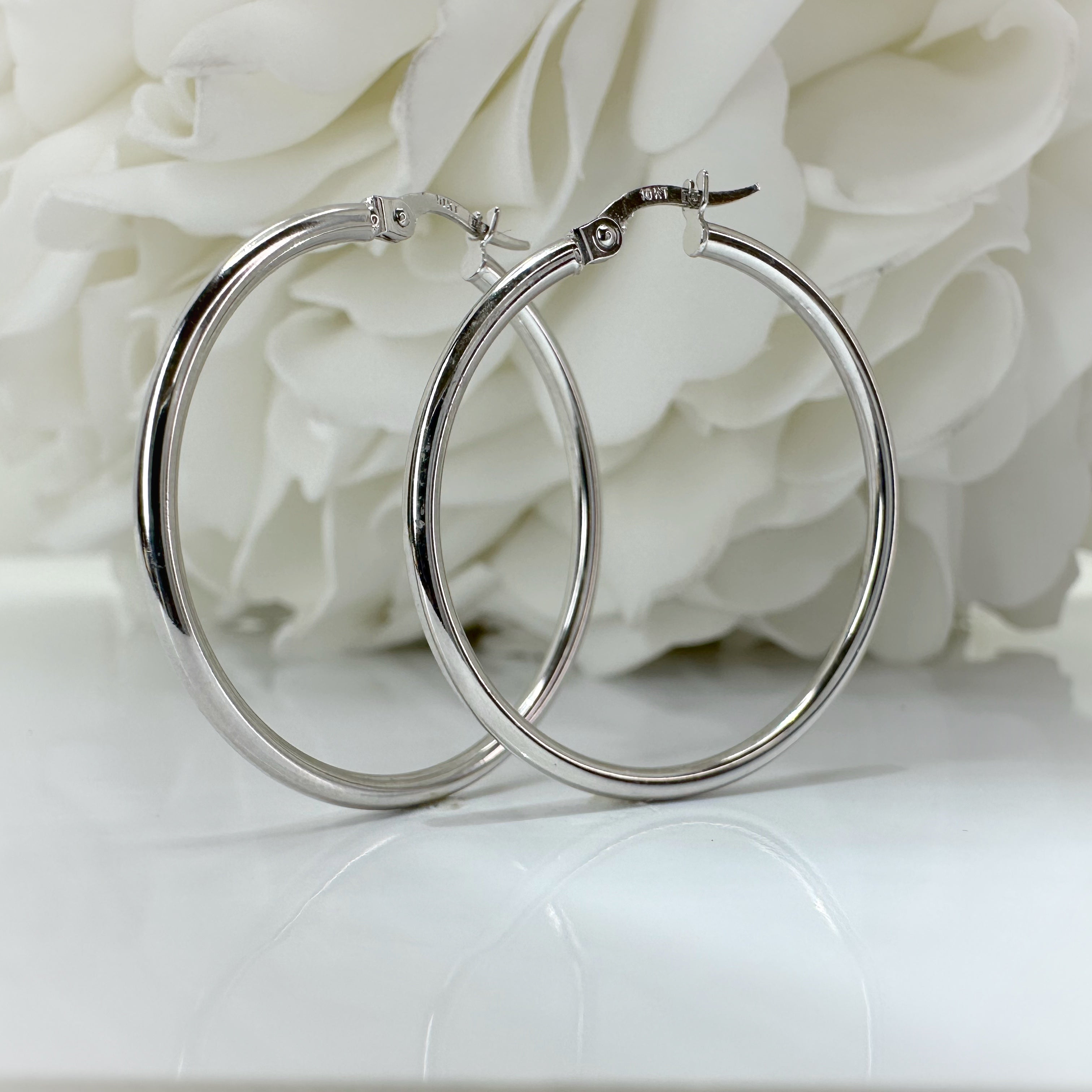 10K white gold high polish plain hoops with latch closure.2mm width34mm diameter