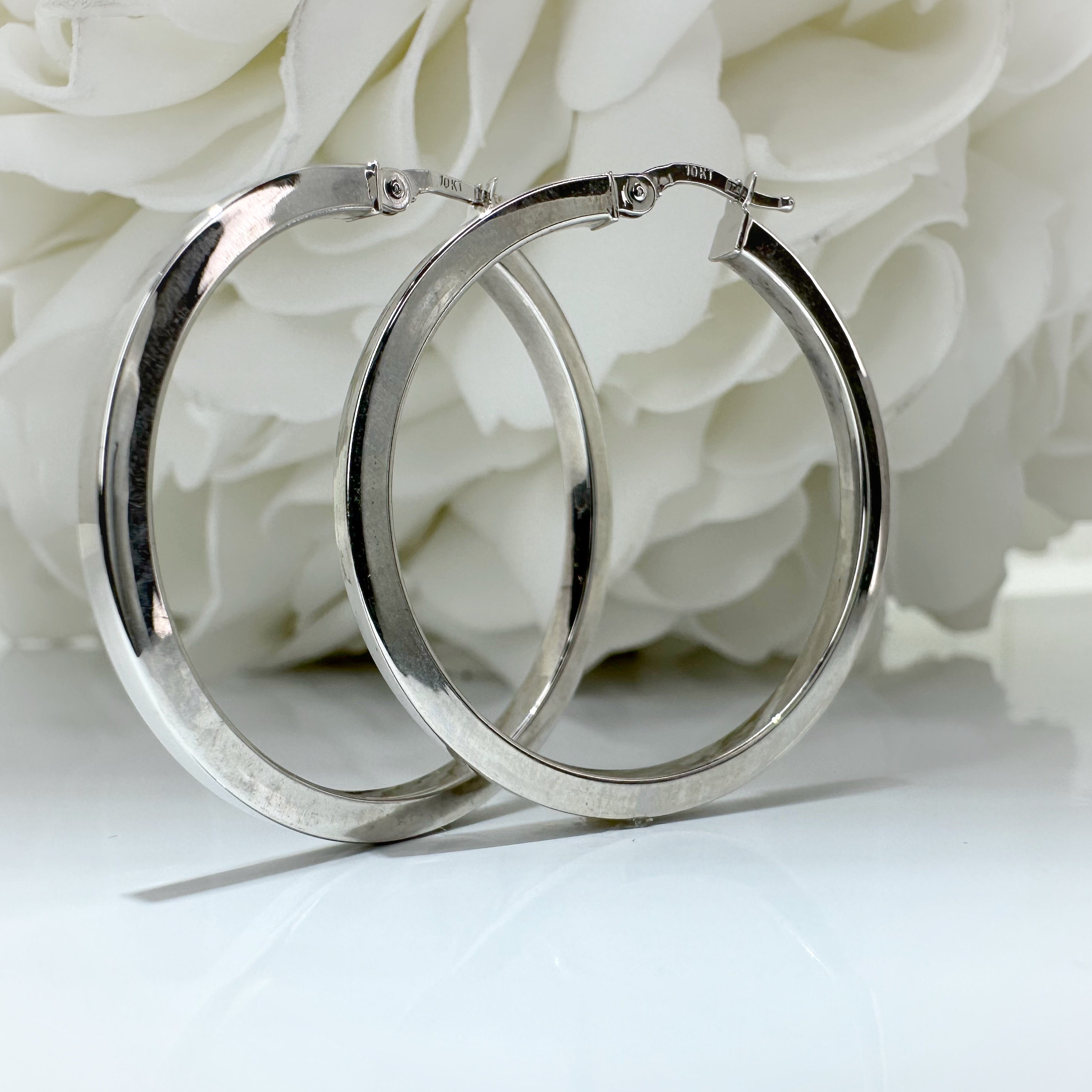 10k white gold square edge hoop earring with latch closure 2.5mm in width 34.2mm in diameter
