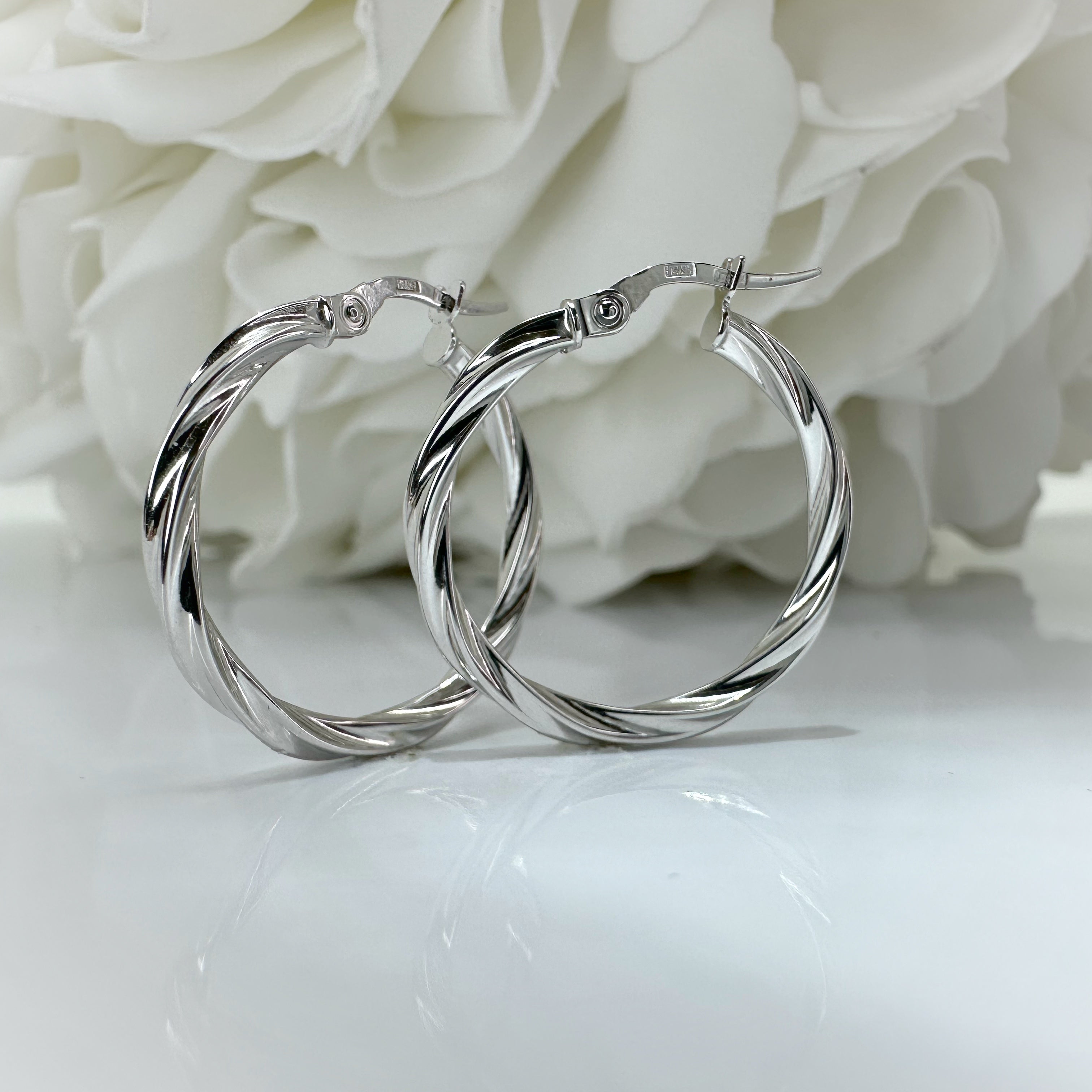 14k white gold twisted hollow hoops with latch closure.2.5mm width 25mm diameter Rhodium plated