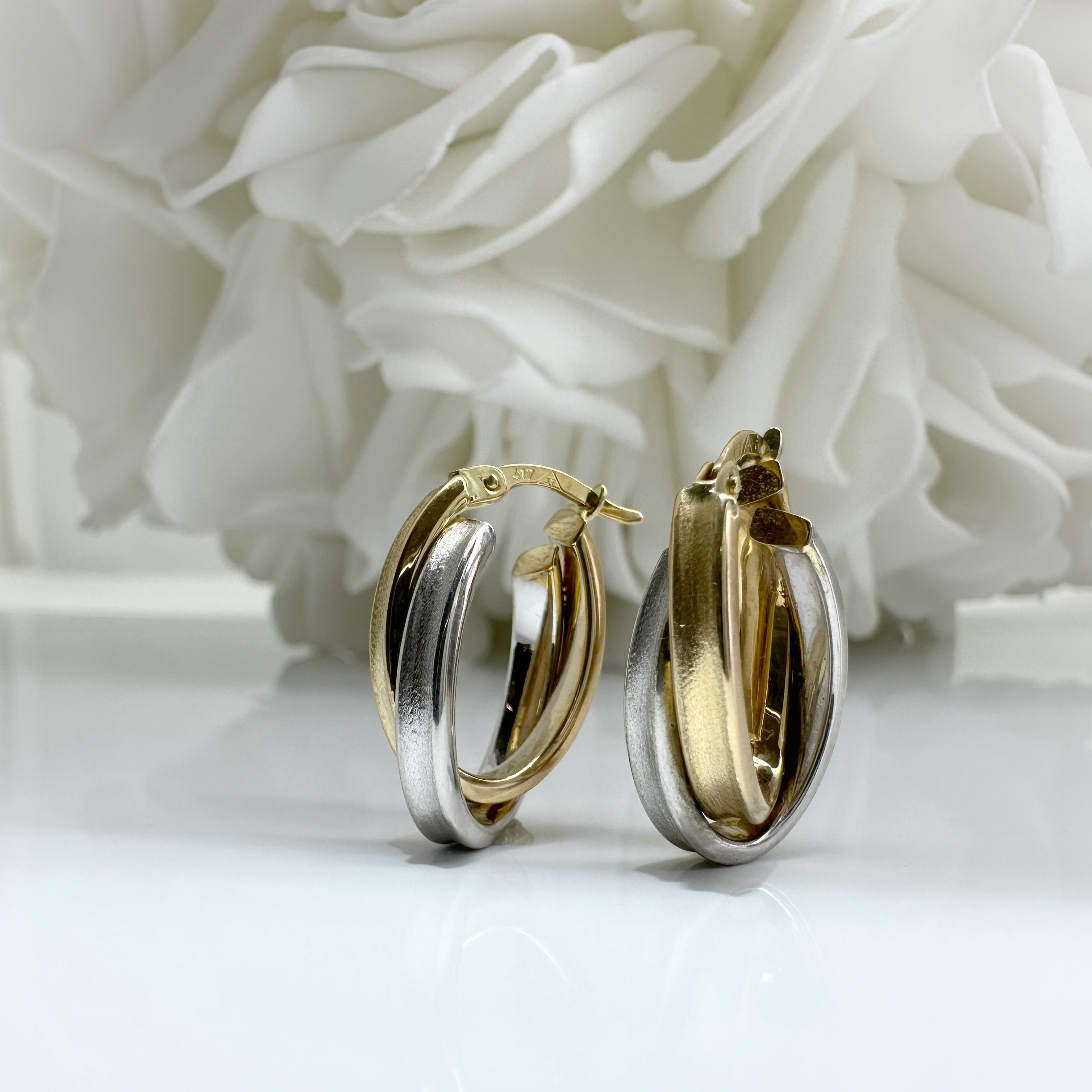 Two tone fancy oval hoop earrings in 10k yellow and white gold with a brushed finish.Height 20.8 mmwidth 12.9mm